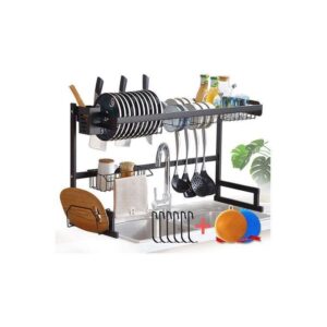 رف تجفيف الأطباق فوق الحوض، رف أطباق من الفولاذ المقاوم للصدأ، طبقتين، مصفاة أطباق كبيرة لمنظم المطبخ، موفر للمساحة، أسود