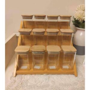 طقم توابل 12 قطعة أكريليك بغطاء خشب مع حامل سلم خشبي منظم للمطبخ