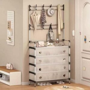 ستاند معطف وحذاء بغطاء غبار، منظم مدخل متعدد الوظائف بثمانية خطافات، تخزين أحذية معدني متين للمنزل والممرات وغرف النوم، باللون الفضي