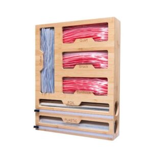 موزع لفافات 6 في 1 مع قاطع، منظم أكياس زيبلوك، قواطع رقائق بلاستيكية من الخيزران، منظم ورق البرشمان والشمع لدرج المطبخ، حامل منظم لفافات الخيزران، حامل مثبت على الحائط