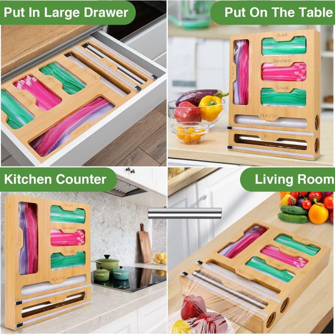 【منظم مطبخ 6 في 1】يجمع المنتج بين وظائف تخزين الأكياس محكمة الغلق وقاطع التغليف البلاستيكي. يحتوي منظم أكياس الطعام هذا على 4 منظمات أكياس بسحاب و2 منظم تغليف من الرقائق المعدنية والبلاستيك. حافظ على الأغطية البلاستيكية وأكياس تخزين الطعام أنيقة ومنظمة مع صندوق الخيزران هذا. منظم مطبخ جميل وعملي للغاية.