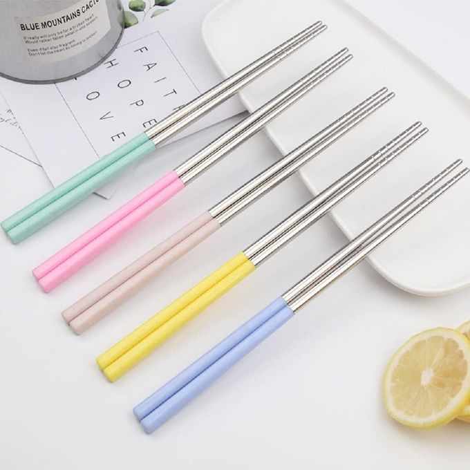 عيدان طعام مزدوجة ستانلس ستيل قابلة لاعادة الاستخدام خفيفة الوزن ومقاومة للانزلاق امنة للغسيل في غسالة الاطباق، ادوات مائدة (5 قطع من عيدان مزدوجة قمحية بالوان متعددة)