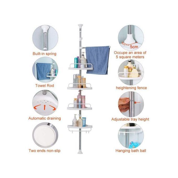 ركنة دش ومنظم الحمام والزاوية - 4 طبقات هو الحل المثالي لتنظيم المساحة في حمامك. يتميز هذا المنتج بسهولة التركيب دون الحاجة إلى أدوات أو حفر، مما يجعله مثاليًا للاستخدام في المساحات الضيقة. يوفر لك استخدامًا كاملاً للمساحة الرأسية، مع تصميمه متعدد الأغراض الذي يتيح لك تخزين جميع مستلزمات الاستحمام بشكل منظم.